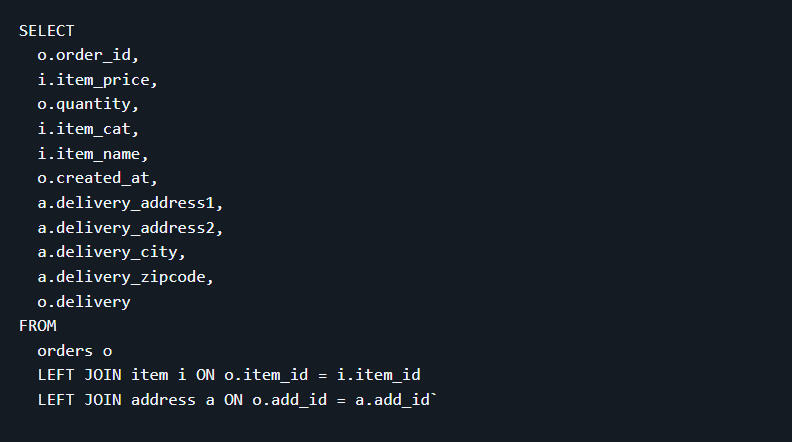 To create orders dashboard, I need to query all necessary information from the order, item, and address tables, which are connected via IDs.